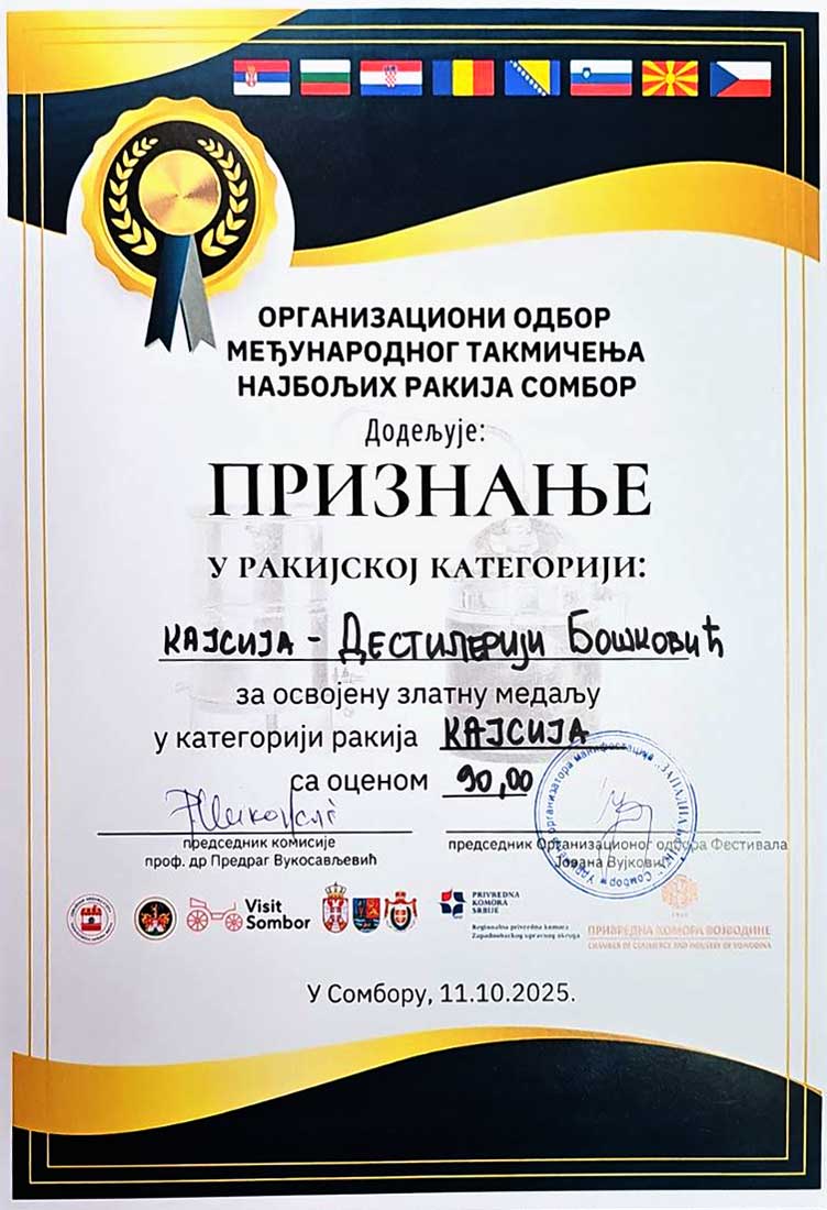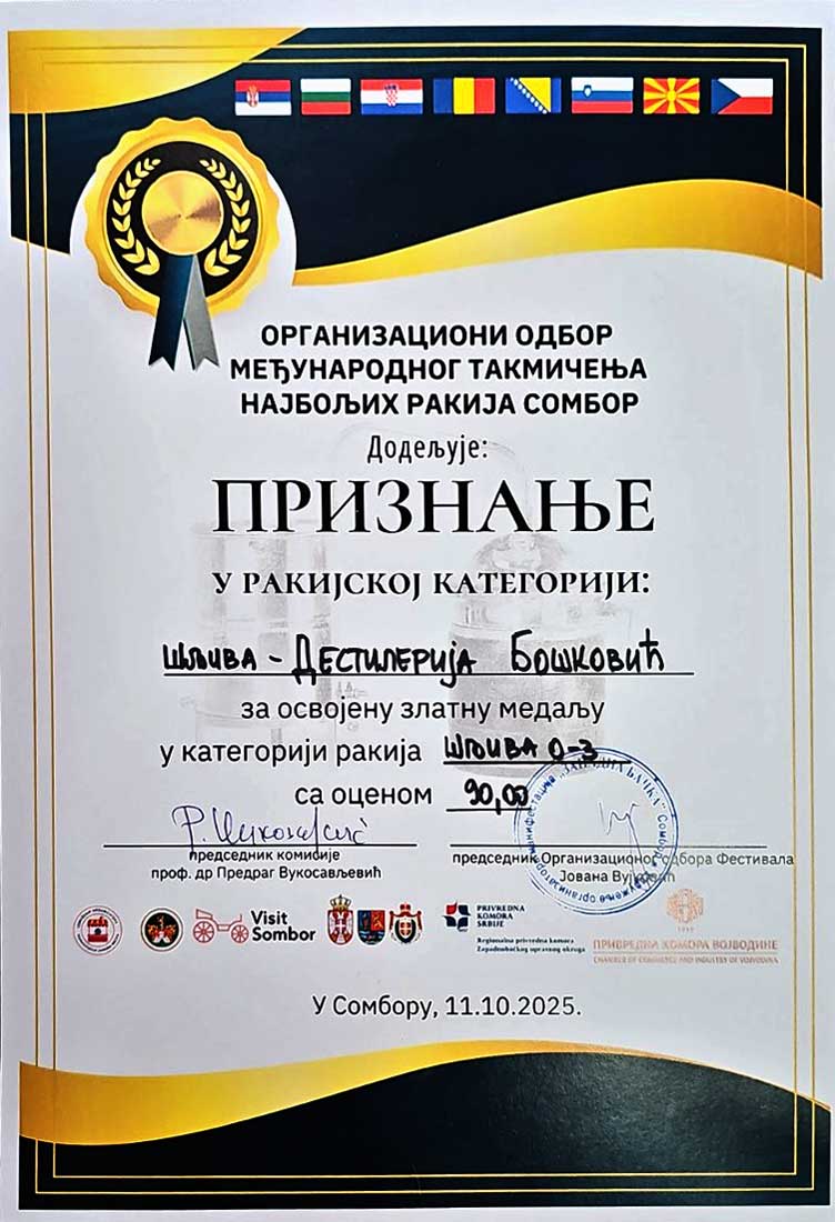 Kvalitet i autentičnost naše rakije prepoznati su i nagrađeni na brojnim domaćim i međunarodnim manifestacijama. Rakija Bošković ponosni je dobitnik priznanja za najbolju rakiju od dunje i šljive, kao i više zlatnih medalja za čistoću i bogatstvo ukusa. Ove nagrade nisu samo potvrda kvaliteta – one su dokaz da naša filozofija, posvećenost i strast imaju vrednost. Svaka čašica rakije Bošković je naš pečat – dokaz da snaga i karakter uvek pronađu svoj put